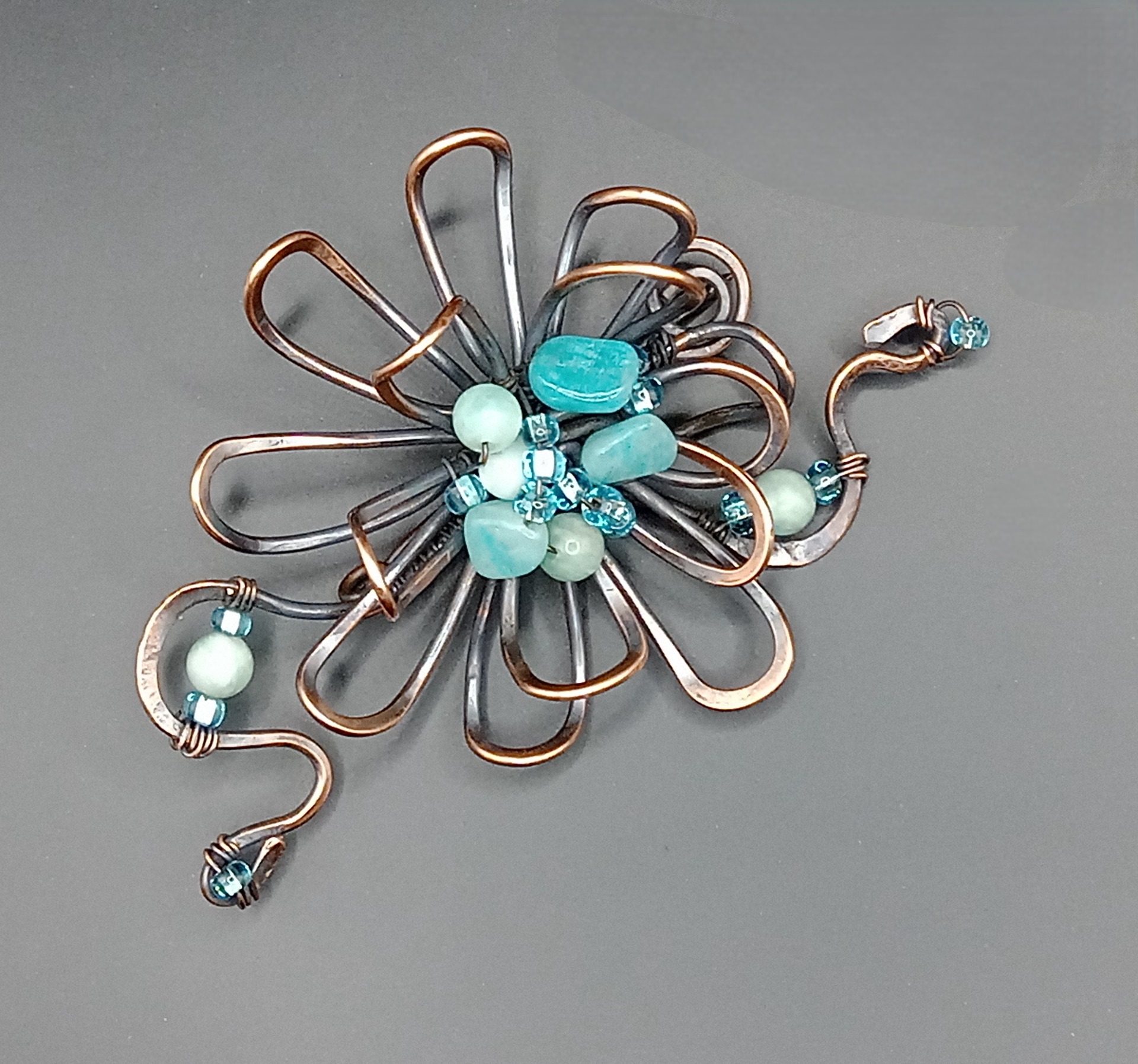 Tato jedinečná brož kombinuje surovou měď se zlomky amazonitu, jejichž tyrkysové odstíny přináší do šperku nádech léta.