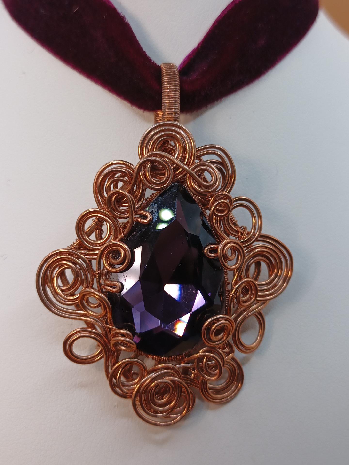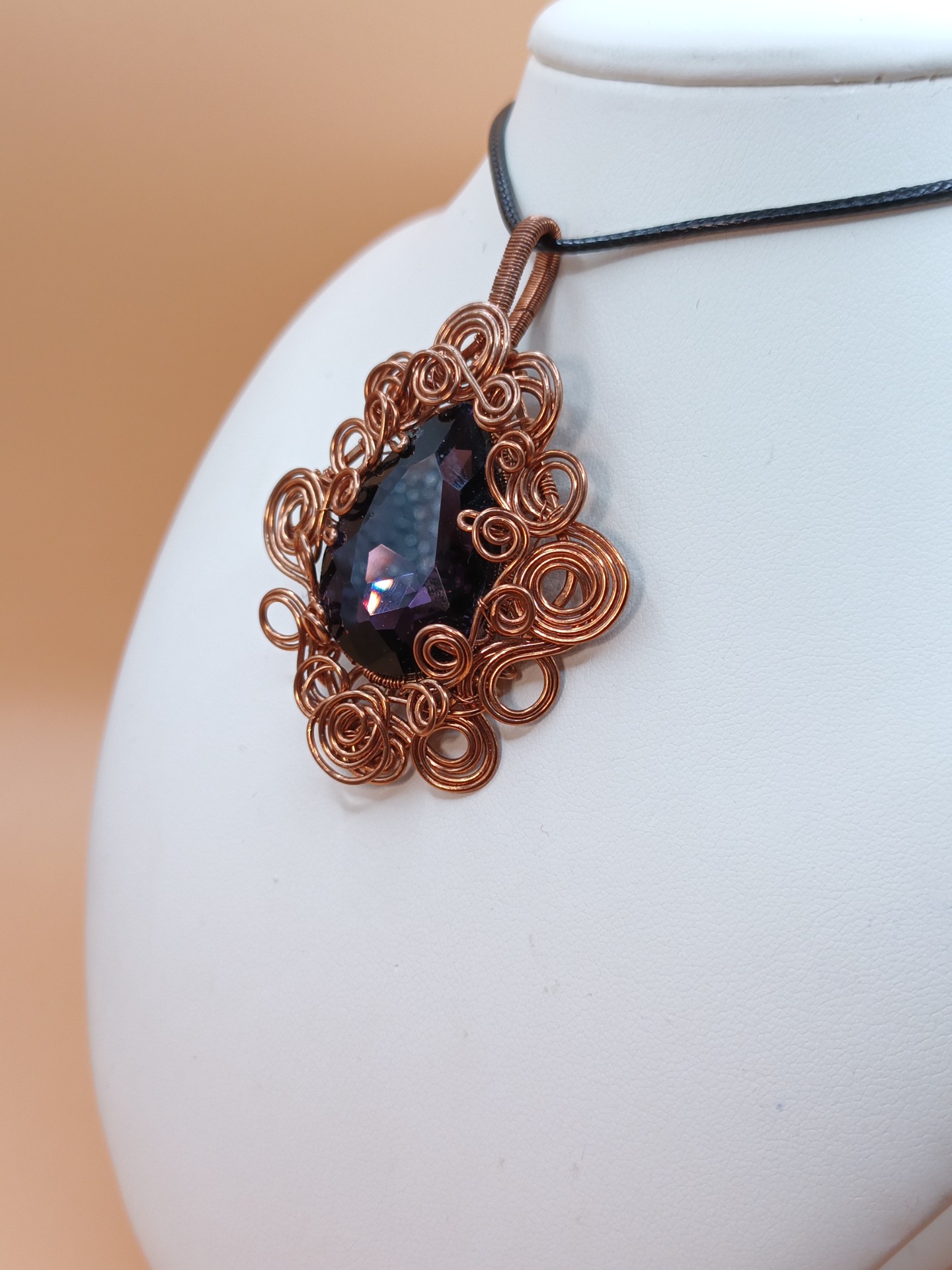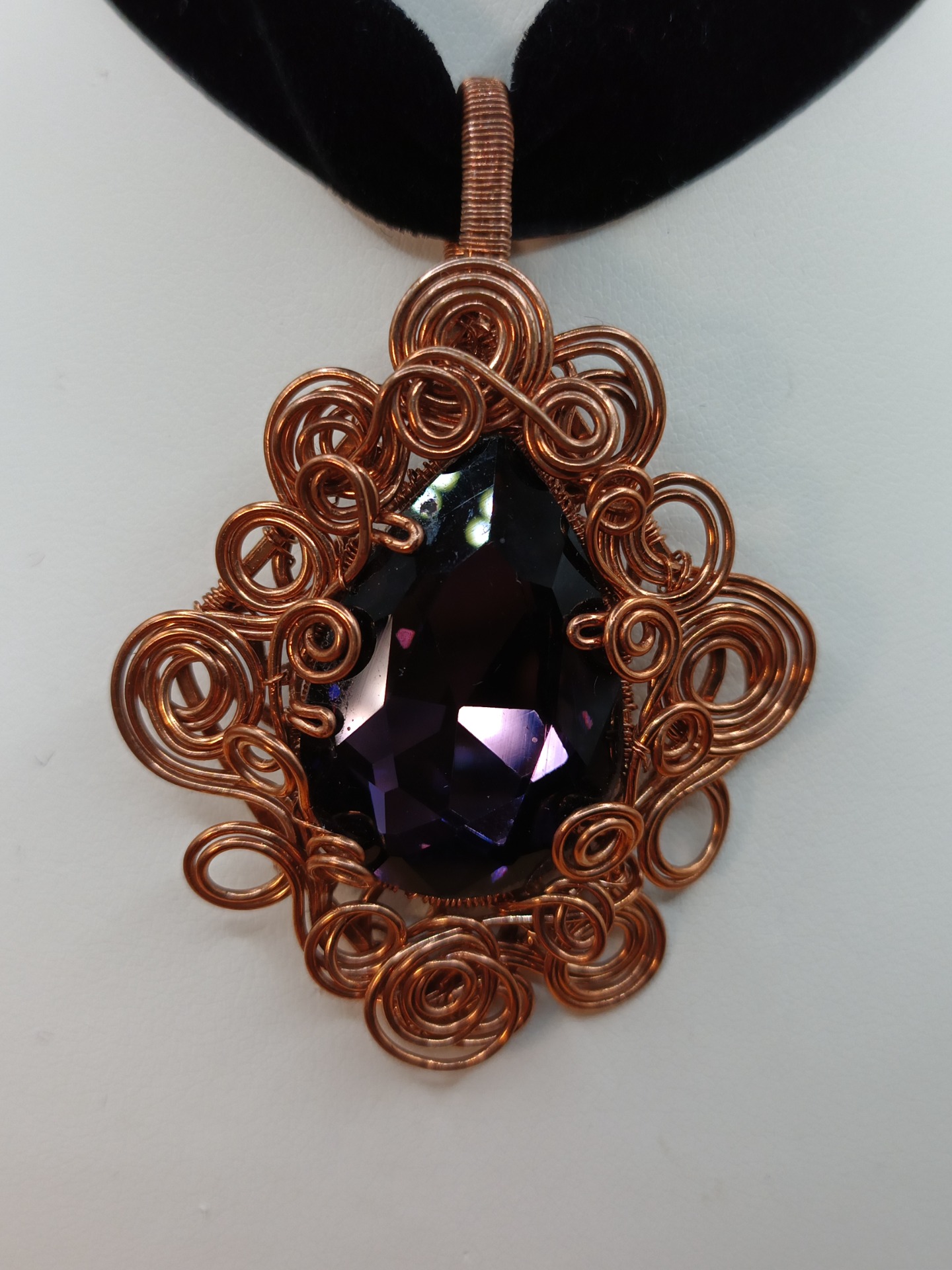 Ve středu šperku se vyjímá velký skleněný fasetovaný kabošon. Jeho tmavě fialová barva působí uklidňujícím dojmem.