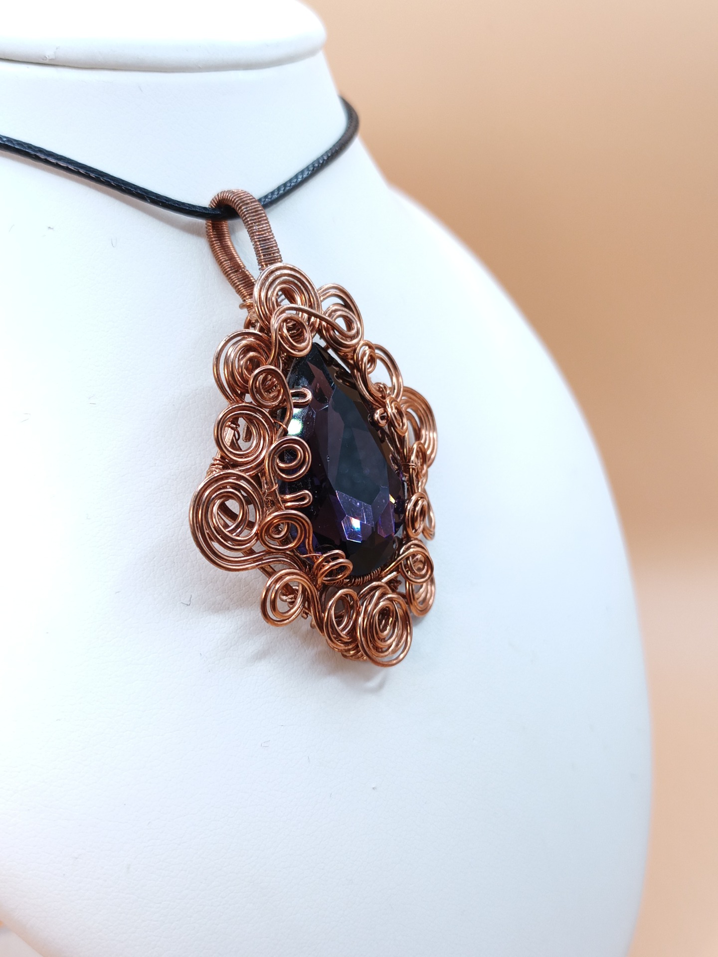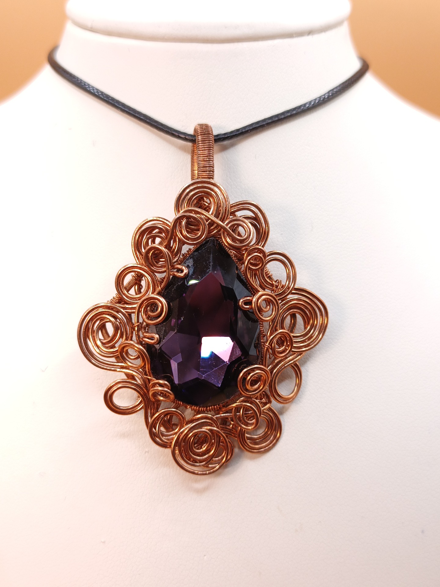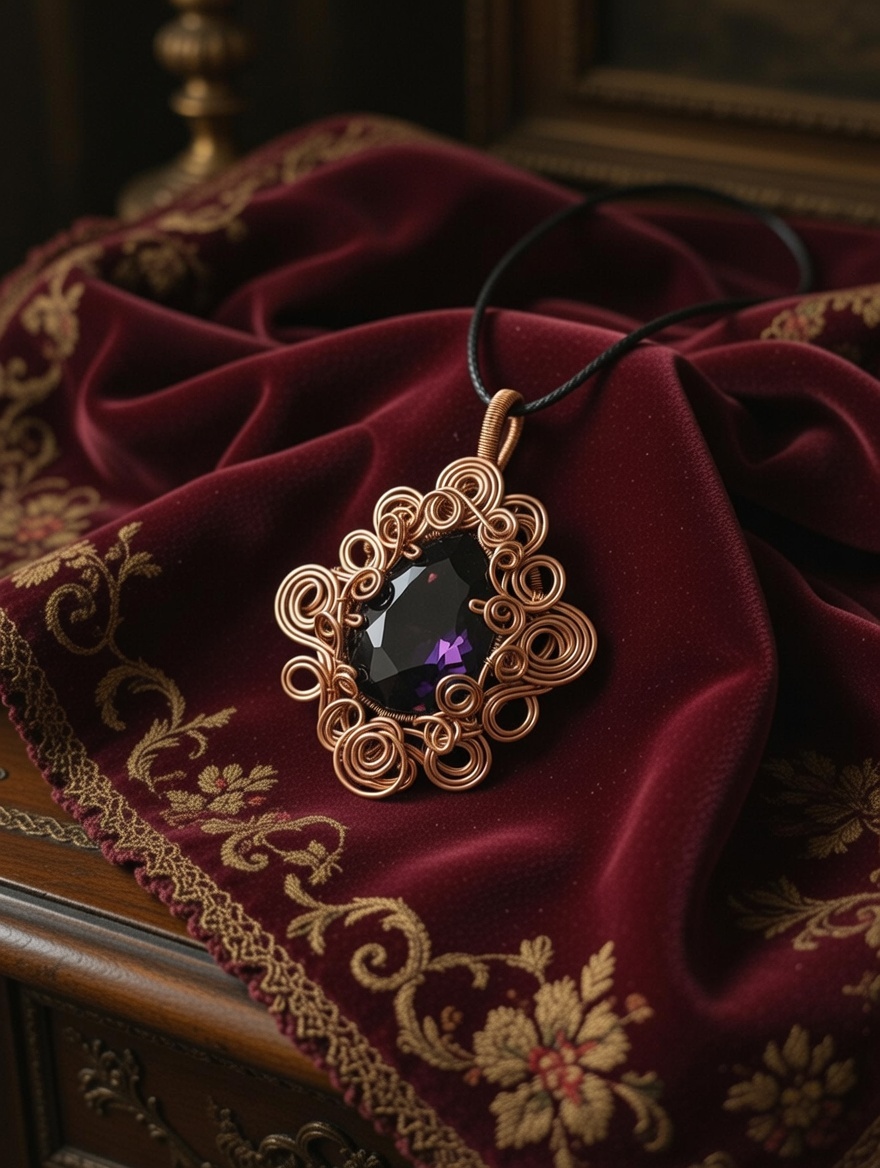 Ve středu šperku se vyjímá velký skleněný fasetovaný kabošon. Jeho tmavě fialová barva působí uklidňujícím dojmem.