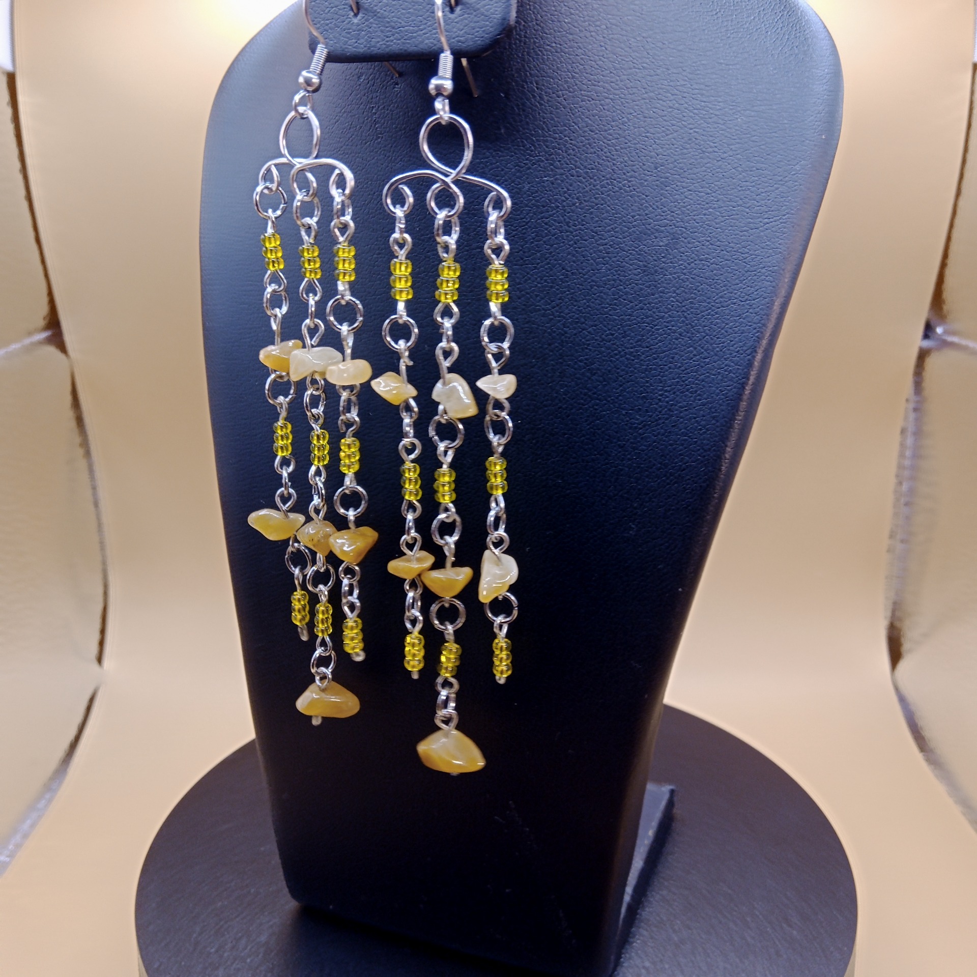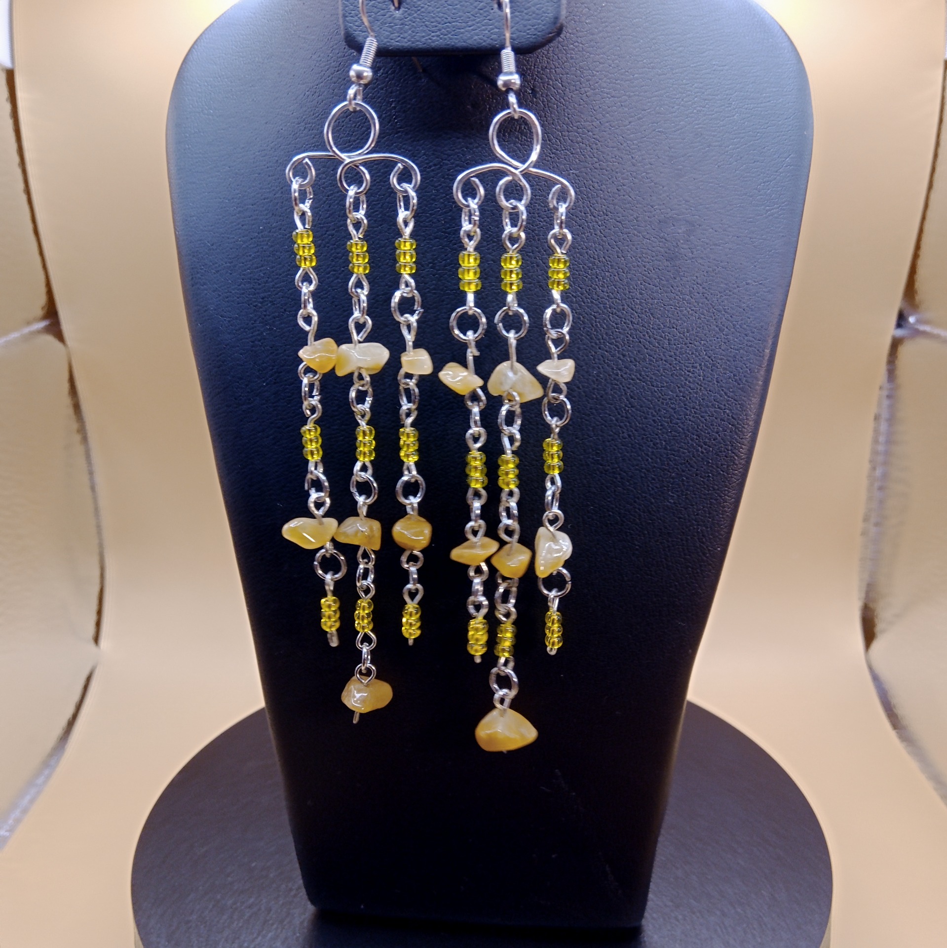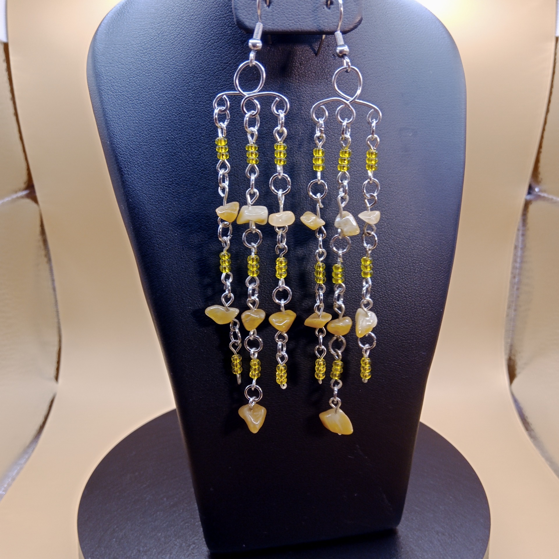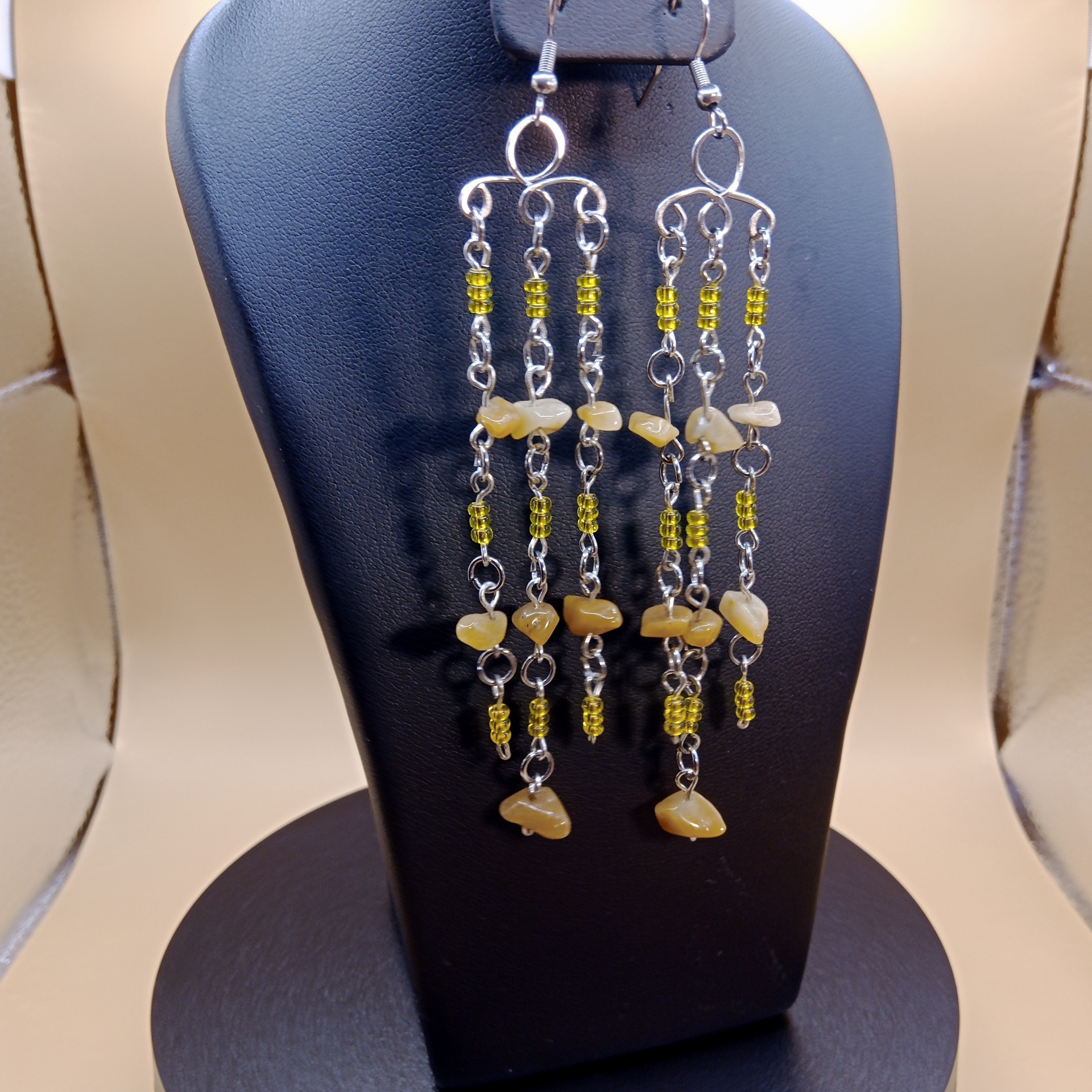 Lehké dvojité náušnice jsou vyrobeny ze zlomků jadeitu, českých skleněných korálků a chirurgické oceli.