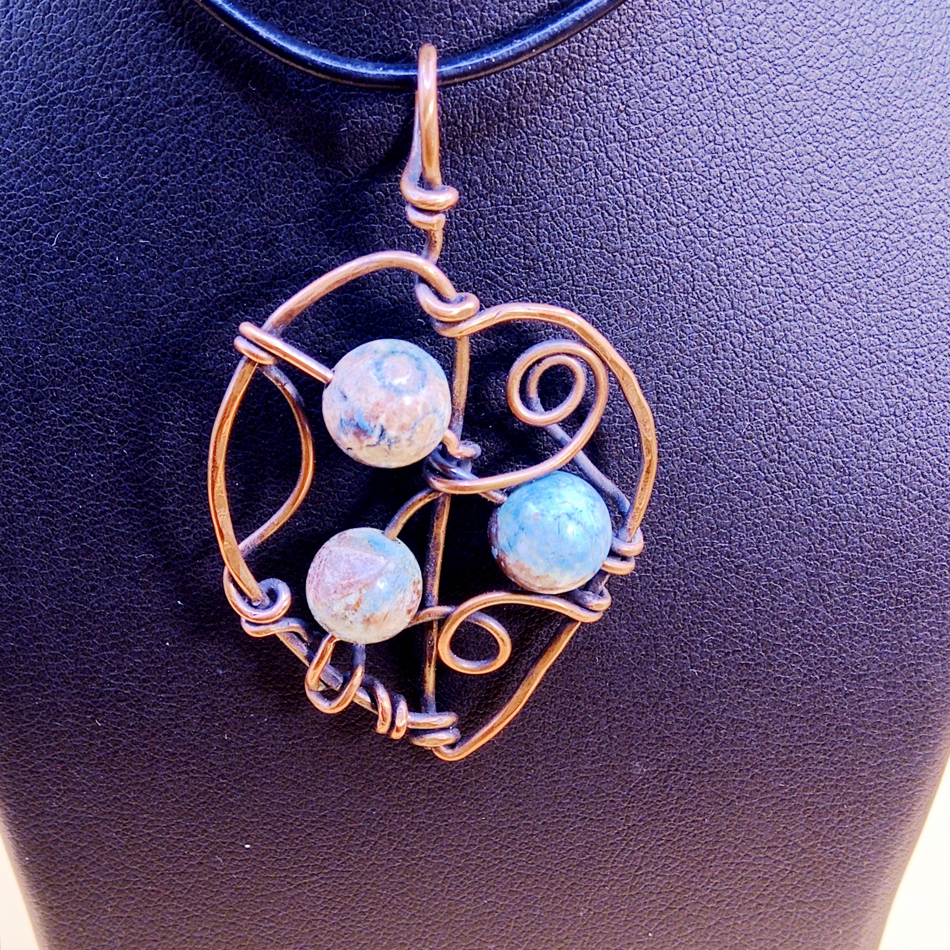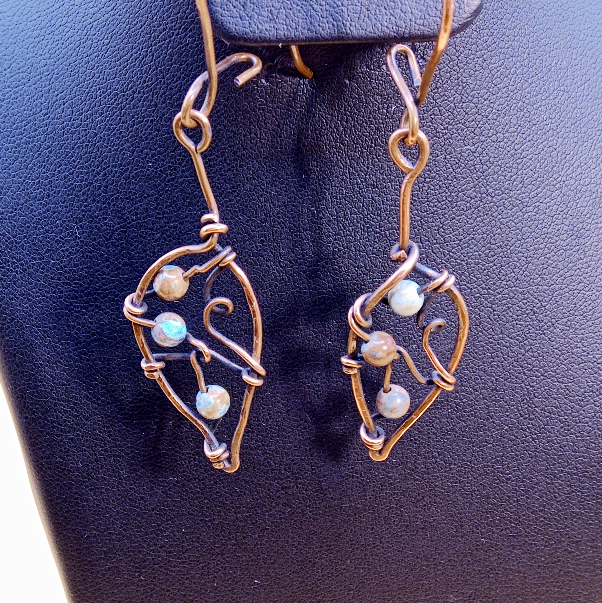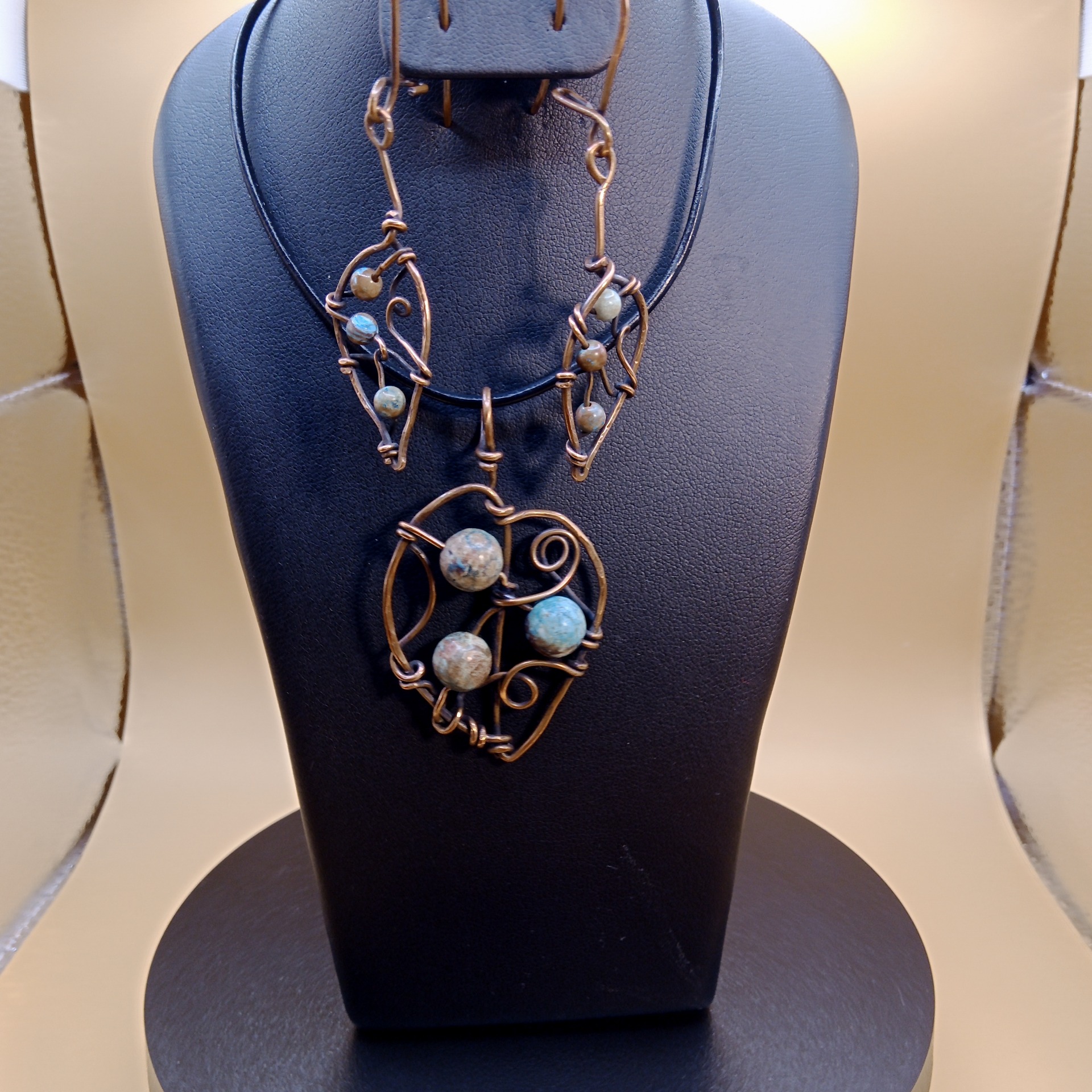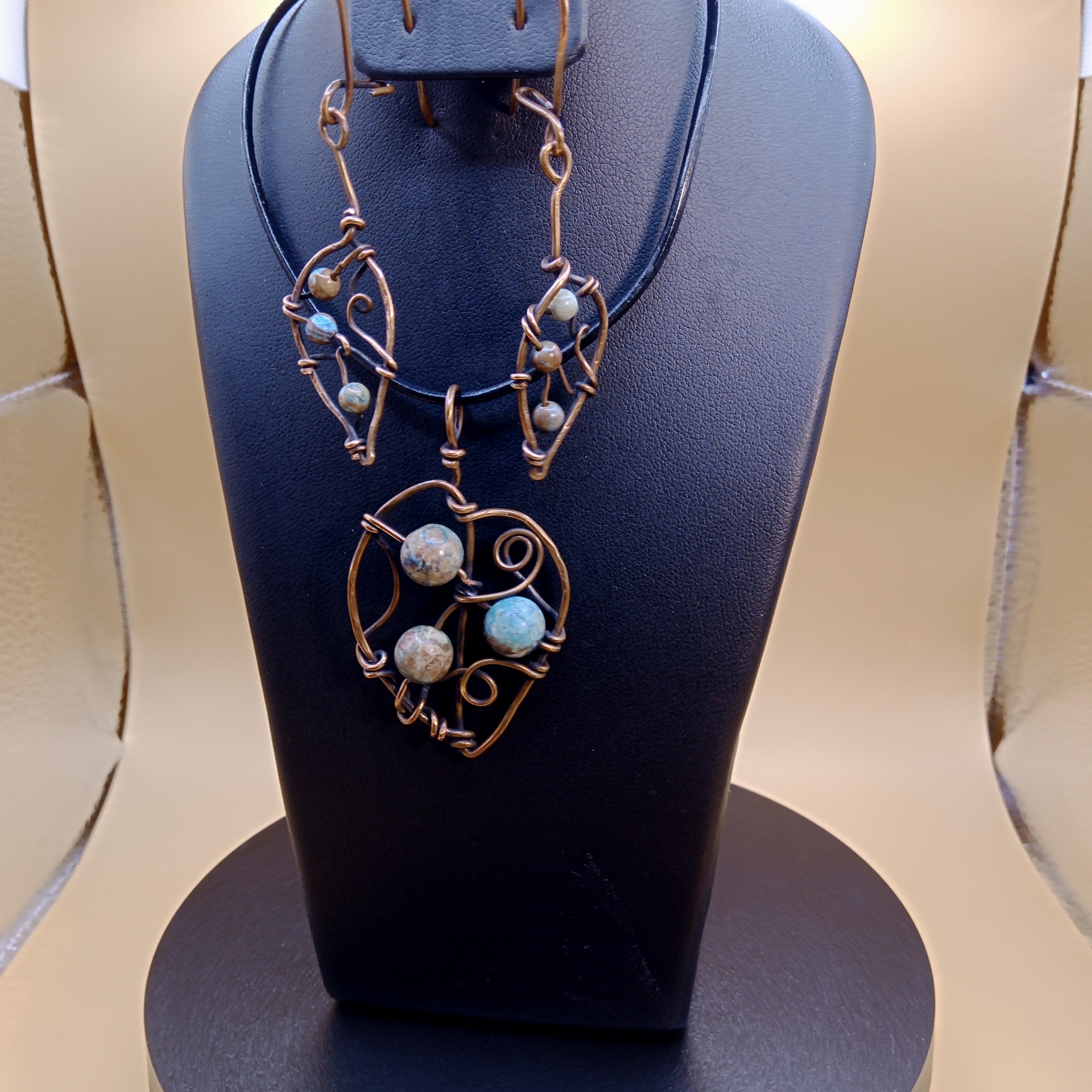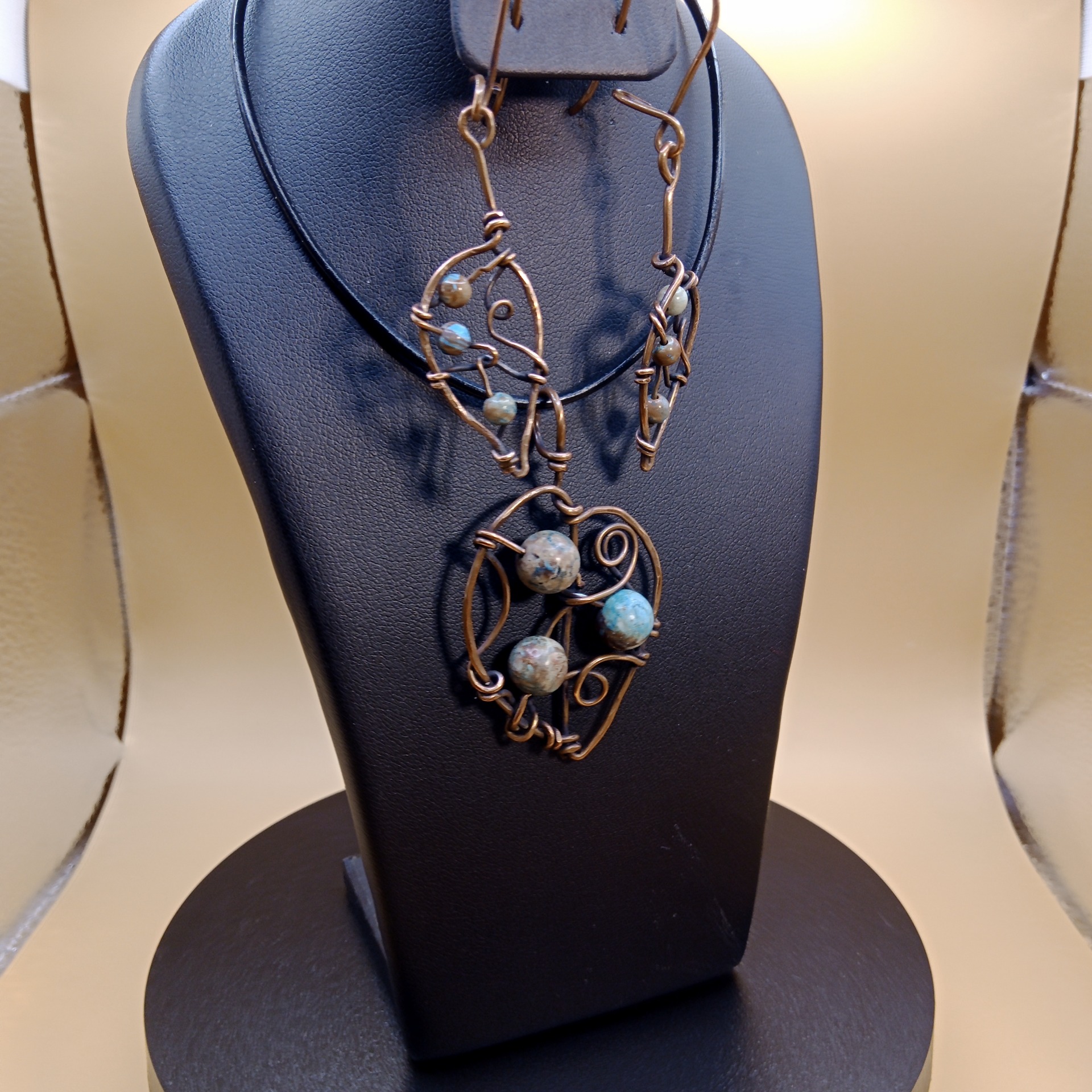 Sada šperků Lístečky je vytvořena ze surové mědi a korálků z chryzokolu.