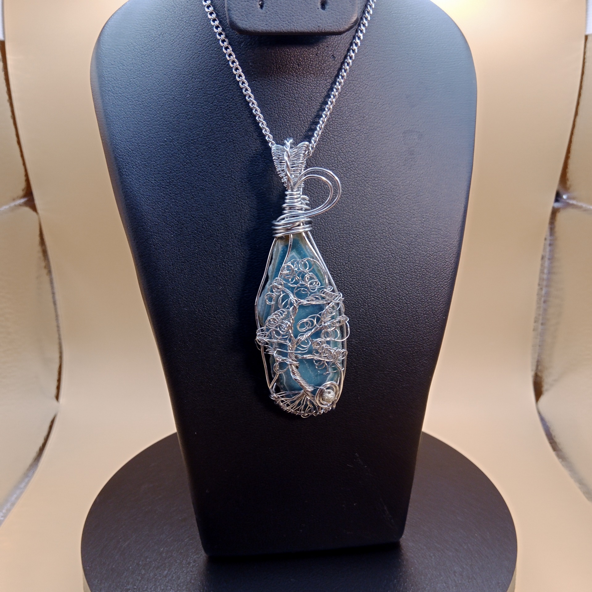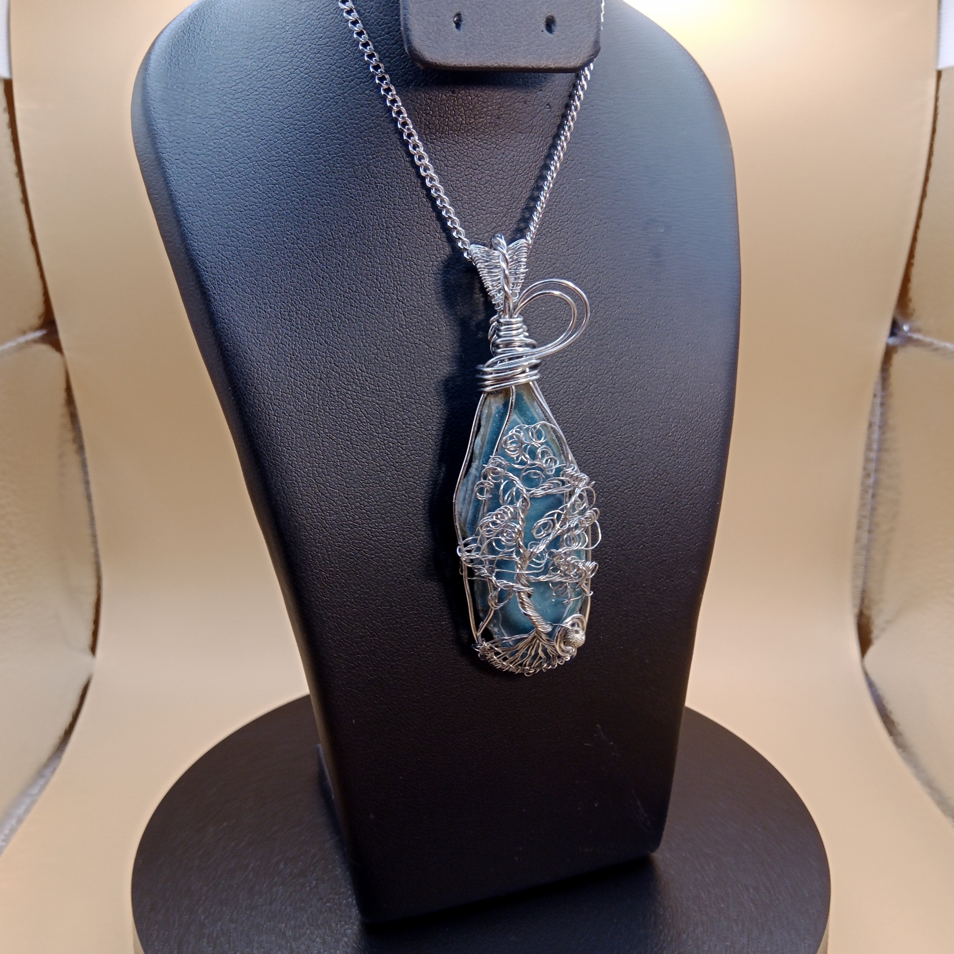 Plátek achátu opletený nerezovým drátem s motivem stromu života, doplněný bižuterním korálkem.