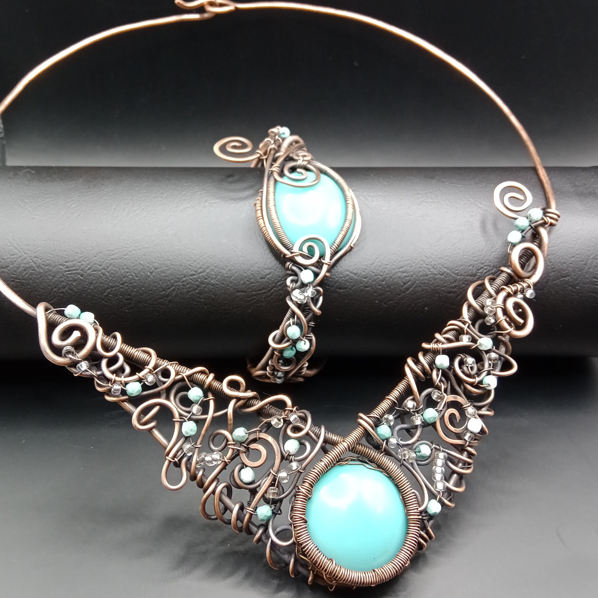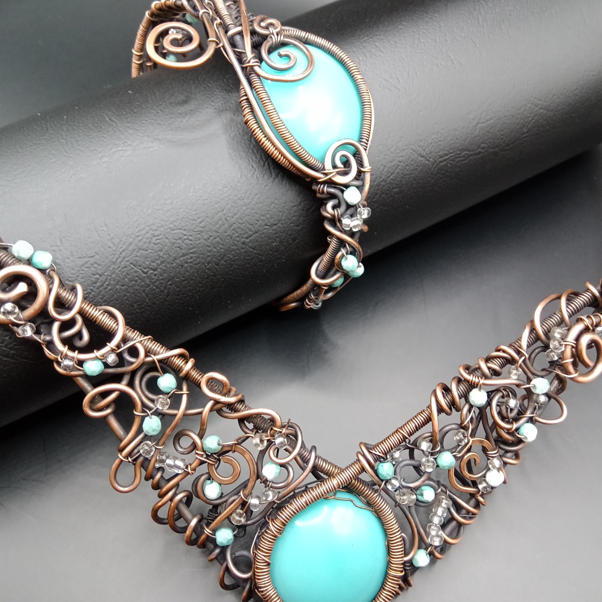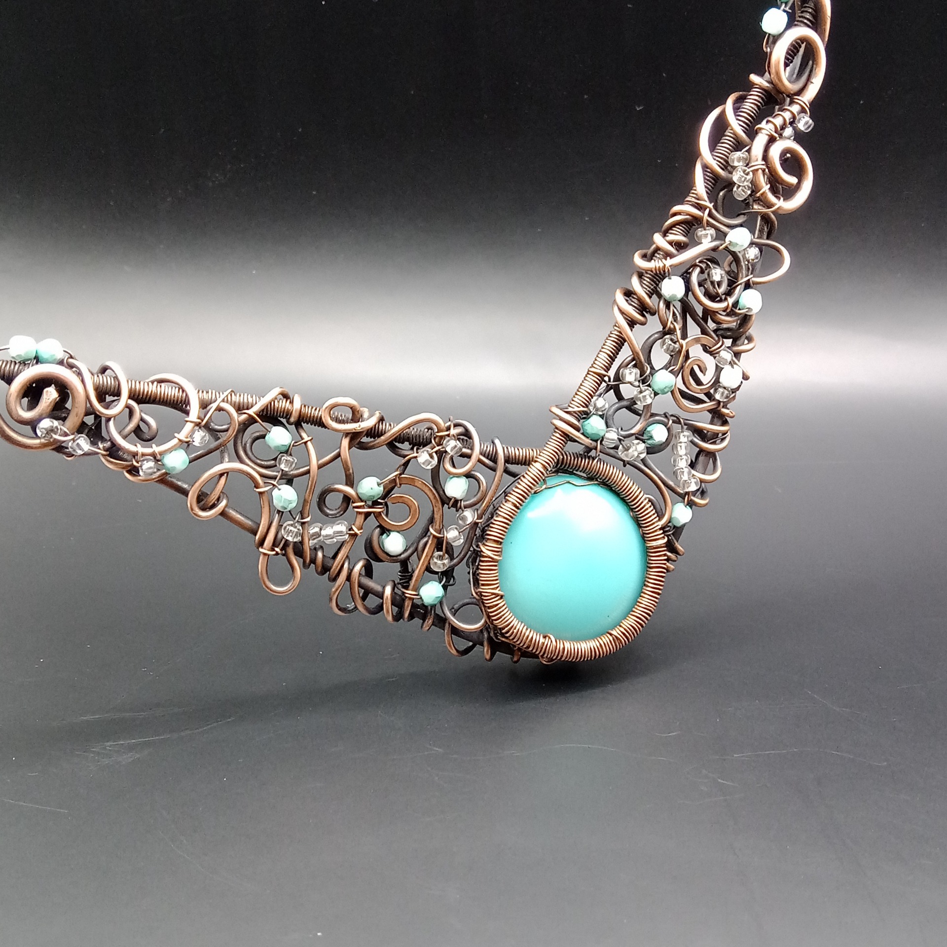 Náhrdelník má charakteristický široký, prohnutý tvar ve stylu statement šperku – bohatě propletený měděný drát vytváří organické spirály, smyčky a křivky, které rámují centrální kabošon.