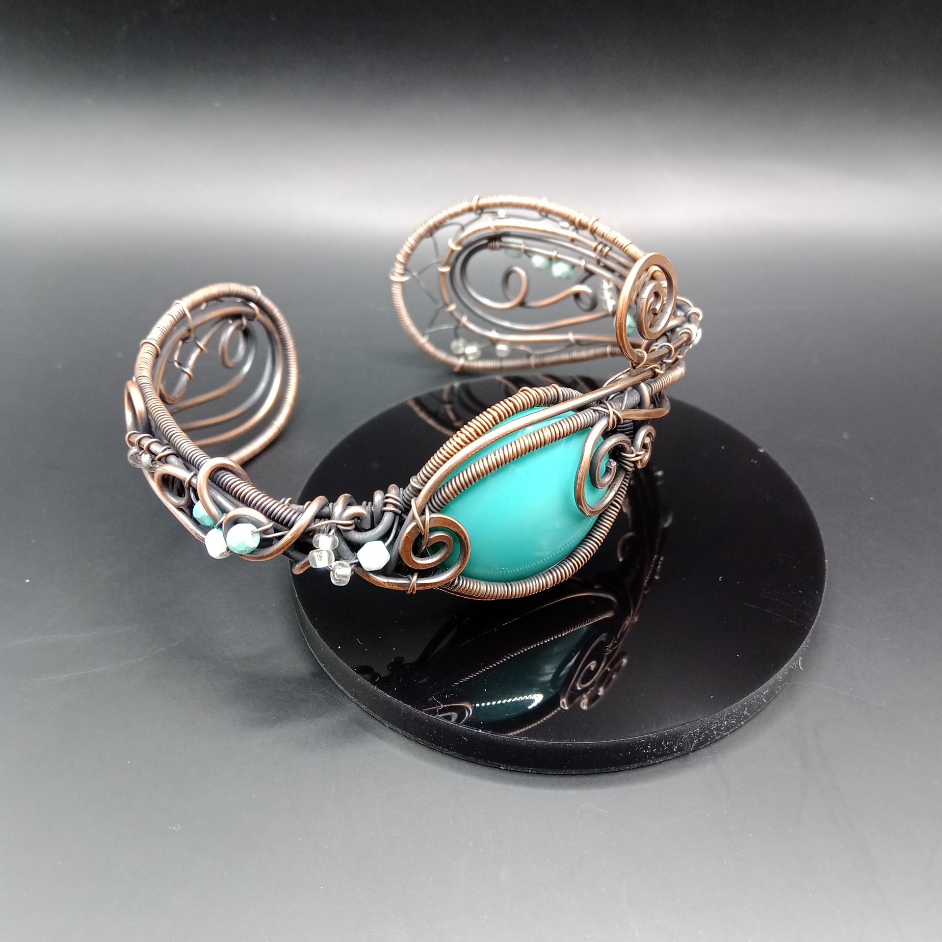 Stejným stylem laděný náramek je o něco subtilnější, ale stále dostatečně výrazný – opět s tyrkysovým kabošonem, obtočeným měděnými spirálami a drobnými korálky, které krásně navazují na náhrdelník.